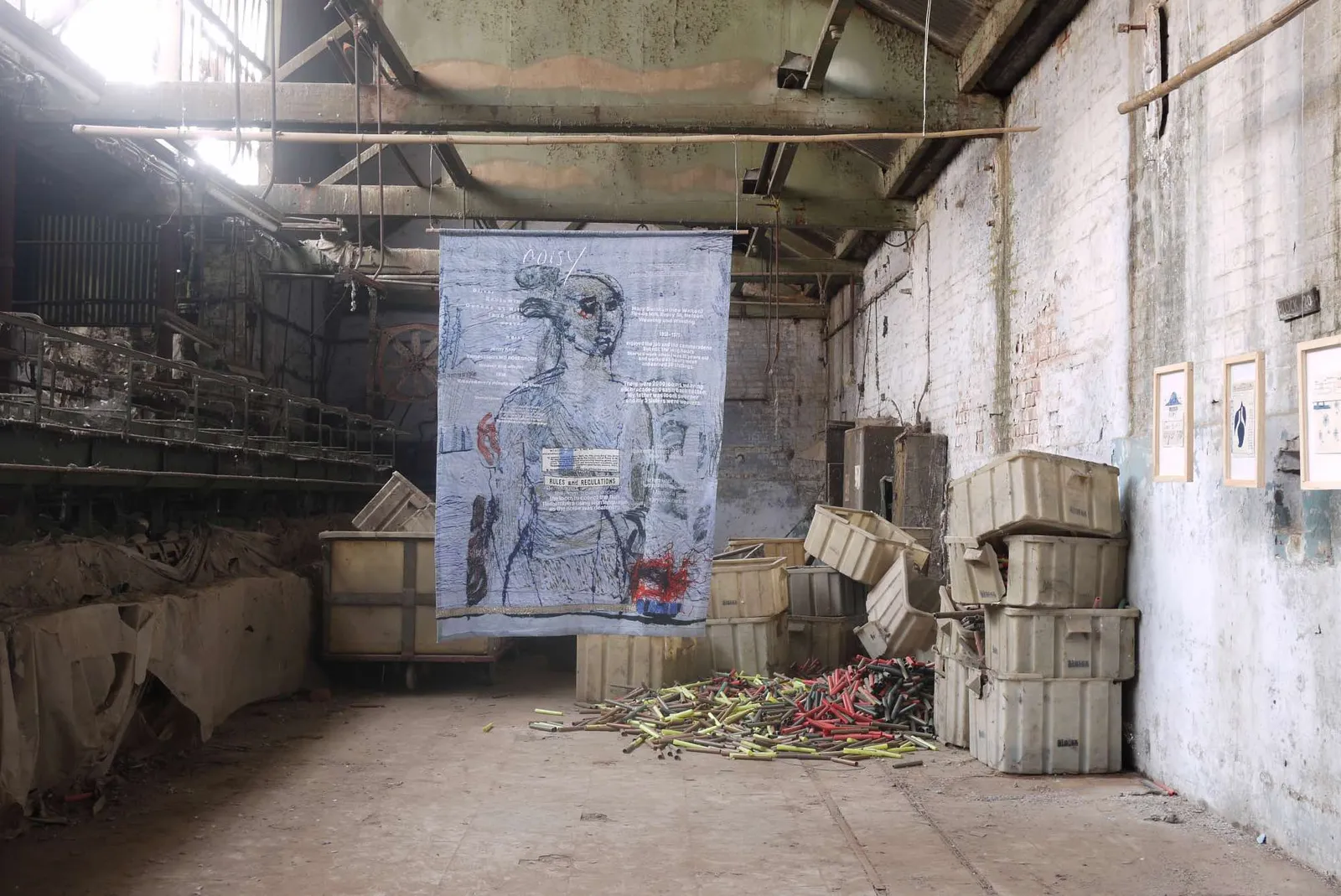These contemporary voices were echoed by stitched testimonies from Queen Street Mill, drawn from mill ledgers and shared with Kettle by Margaret Nowak. The words recalled the sensory and emotional realities of mill life, from the deafening noise of the looms to the lingering smell of the size room, where carcasses were boiled to produce a cheap, gluey thickener. Together, they preserved memories of labour, loss, and making.
