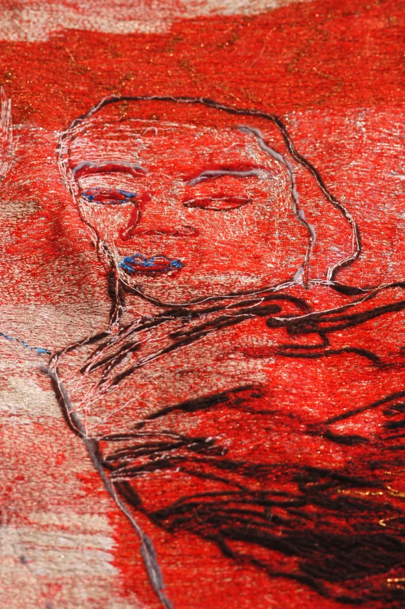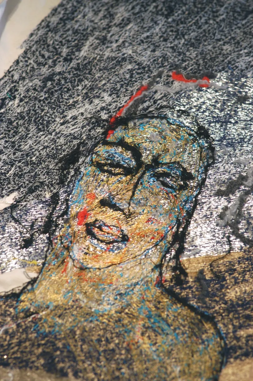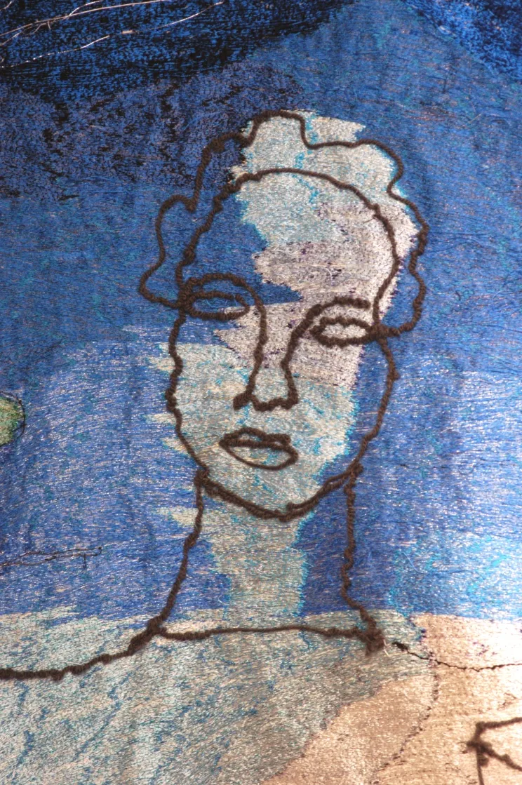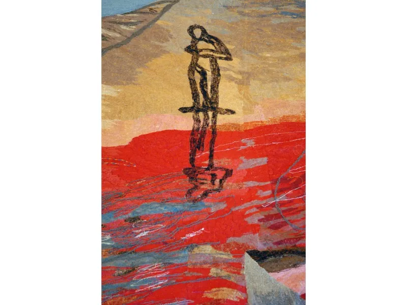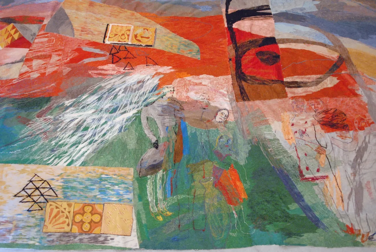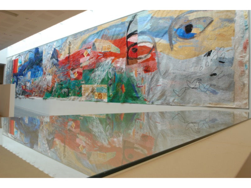 Looking Forwards to the Past (2007) emerged as an immense, multi-layered composition, rich in surface texture and suffused with colour and light. It is a narrative work which shows the scattered imagery of a historical city and its attitude to the present and vision of the future. Measuring 16.5 metres in length and 3 metres in height, it stands among the largest embroidered works ever undertaken by a single artist.
