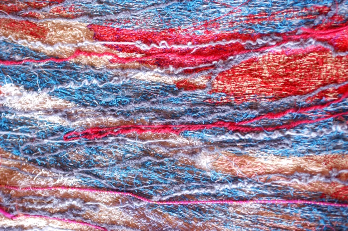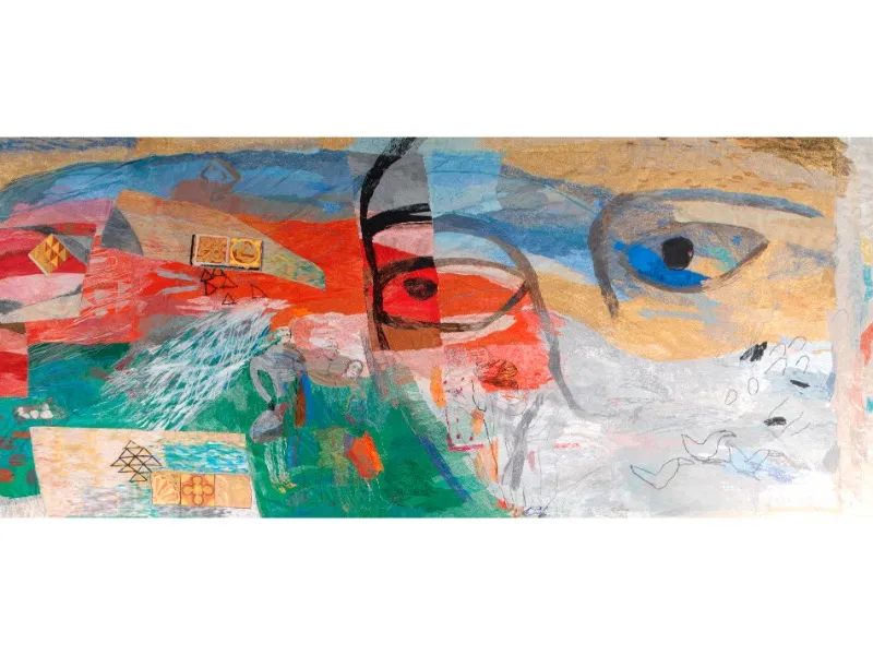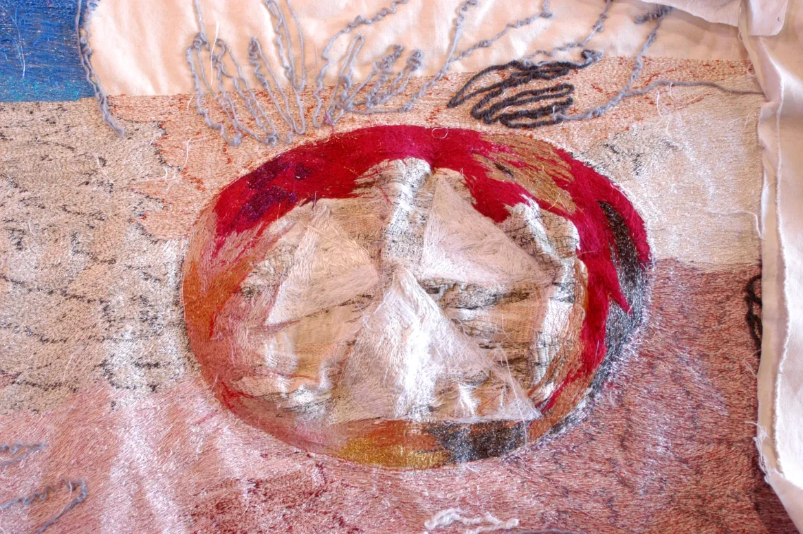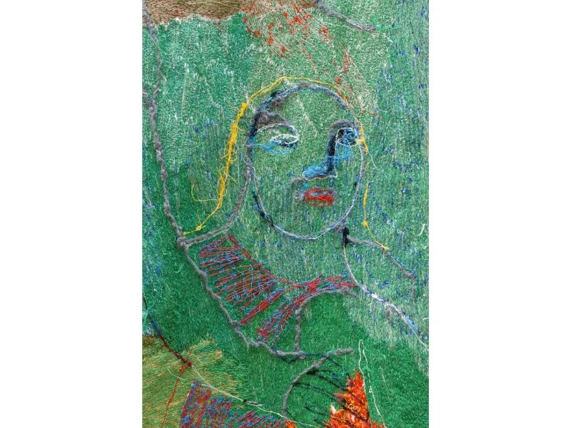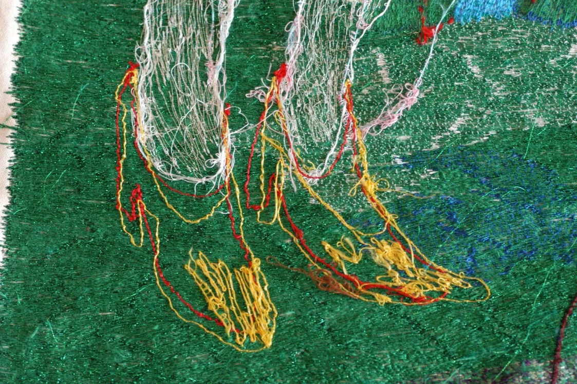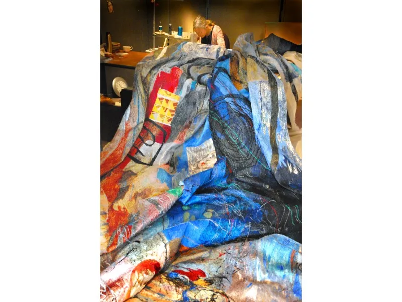 Looking Forwards to the Past (2007) emerged as an immense, multi-layered composition, rich in surface texture and suffused with colour and light. It is a narrative work which shows the scattered imagery of a historical city and its attitude to the present and vision of the future. Measuring 16.5 metres in length and 3 metres in height, it stands among the largest embroidered works ever undertaken by a single artist.
