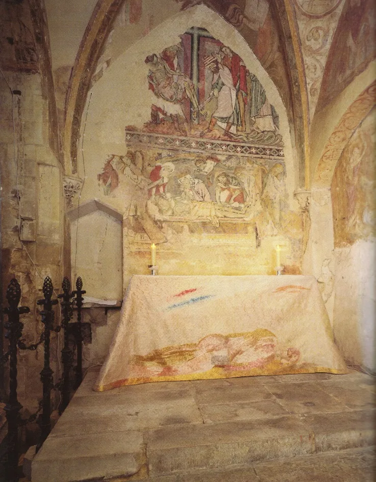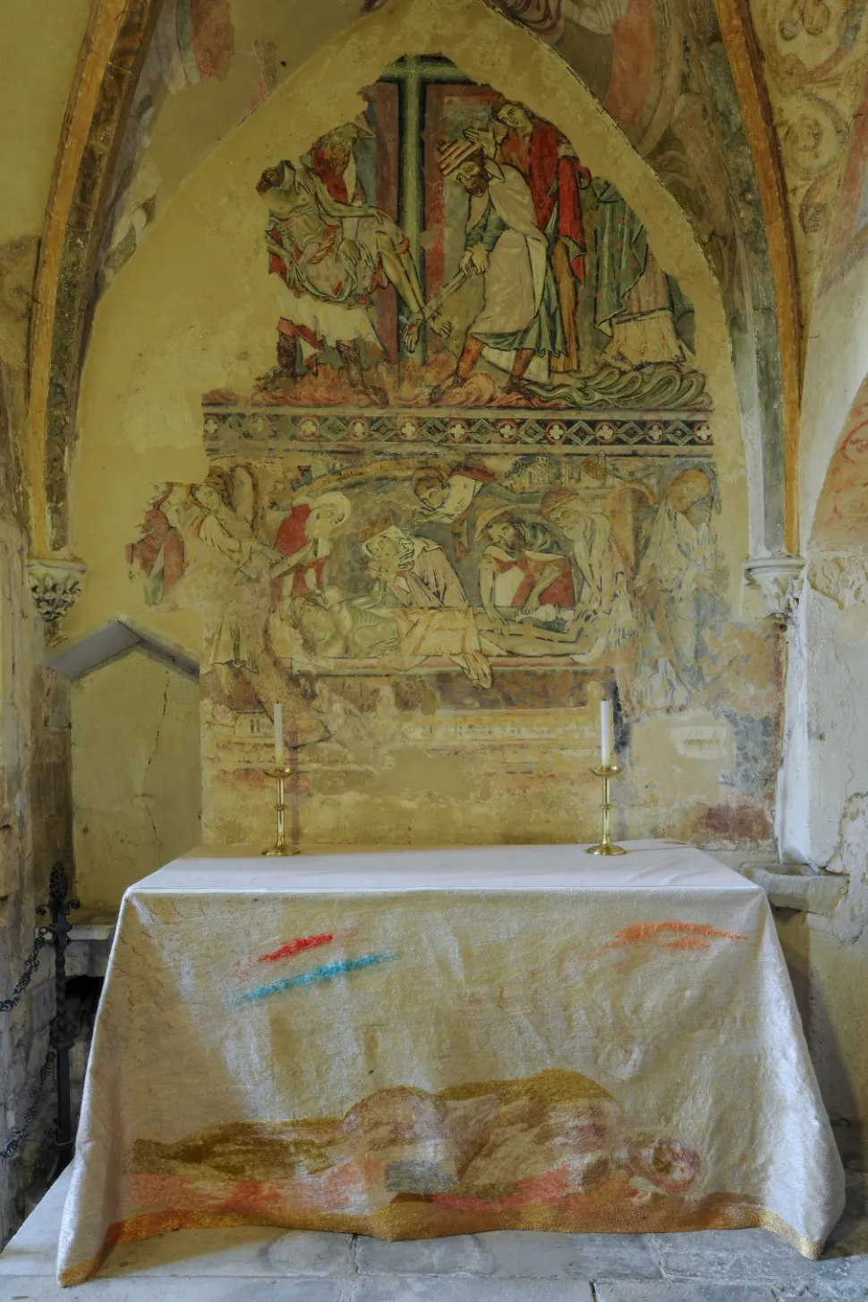 In terms of visual design, this strength is also suggested by the symbolism of the pyramid. The attentive eye will notice a progression upward, from the solitary figure of the frontal, through the Deposition scene, to the Pantocrator above, Christ in majesty. Another device I have used is to draw the gaze of the viewer from outside the Chapel through the open arch and into the intimacy of the Chapel by continuing the legs of Christ around the near side of the altar. If the decay of time and death is one impression of the Chapel, then hidden strength and majesty is surely the underlying statement. I have sought to hint at this mystery, and to complement these beautiful paintings in my own medium of thread.